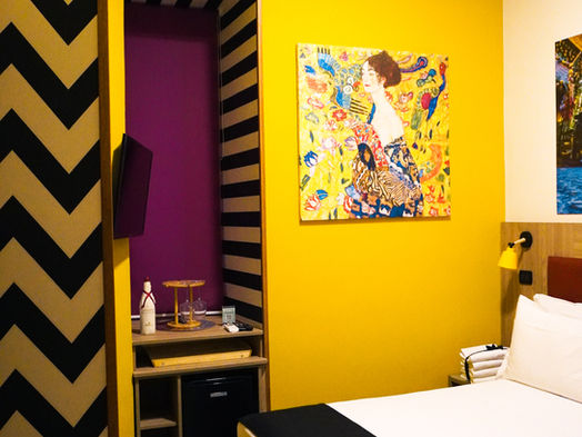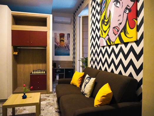 La Yellow Room regala un’atmosfera calda e luminosa. Pensata come spazio accogliente e funzionale, offre un rifugio ideale per chi desidera un ambiente intimo dove riposarsi o prepararsi a nuove avventure. I dettagli in giallo e le decorazioni dal gusto pop art creano un’armonia stimolante, rendendola il complemento perfetto per un soggiorno che sprizza energia.